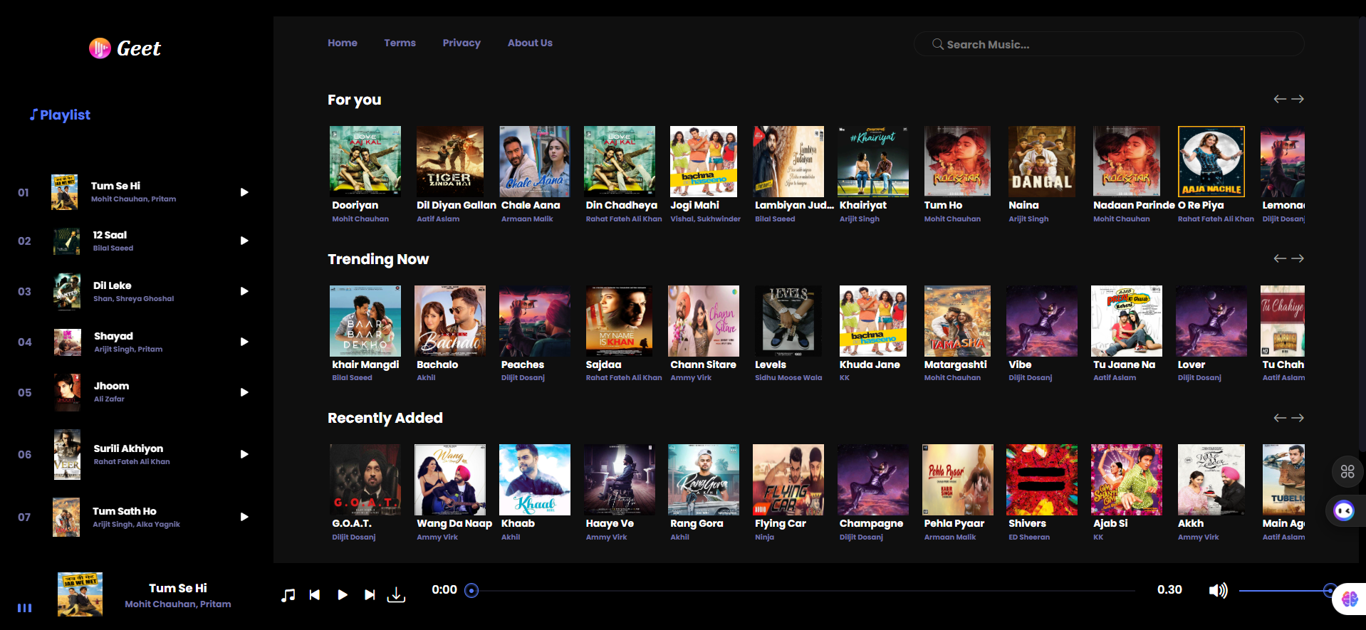 A music-inspired web application designed to showcase songs and playlists with a clean, user-friendly interface. Built with modern web technologies, it emphasizes smooth navigation and responsive design for an engaging listening experience.